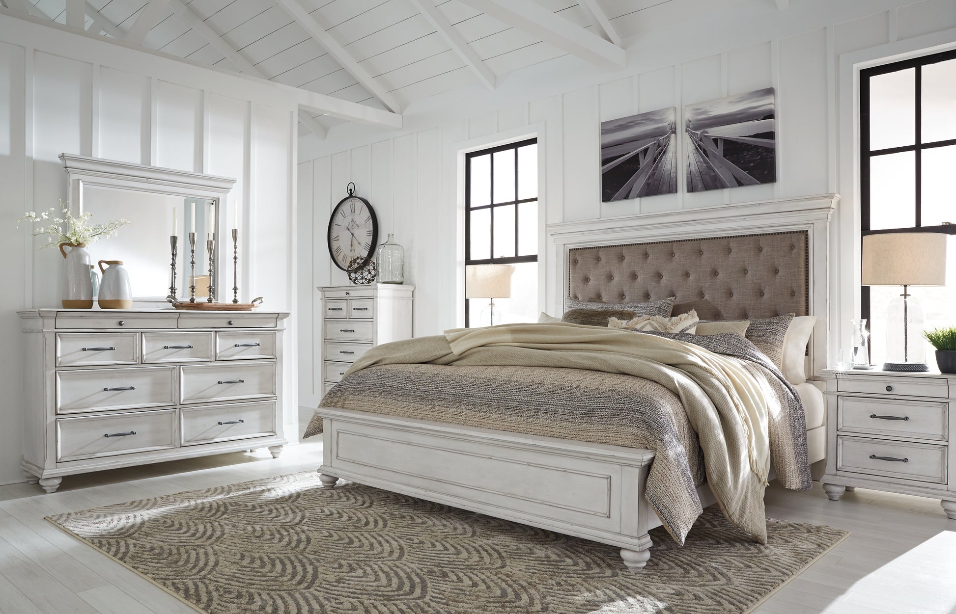 | Details | Includes queen upholstered headboard, panel footboard and rails, Made with solid wood, veneers and engineered wood, Distressed whitewash finish, Button tufted fabric upholstery, Nailhead trim, Foundation/box spring required, sold separately, Mattress available, sold separately, Assembly required | |